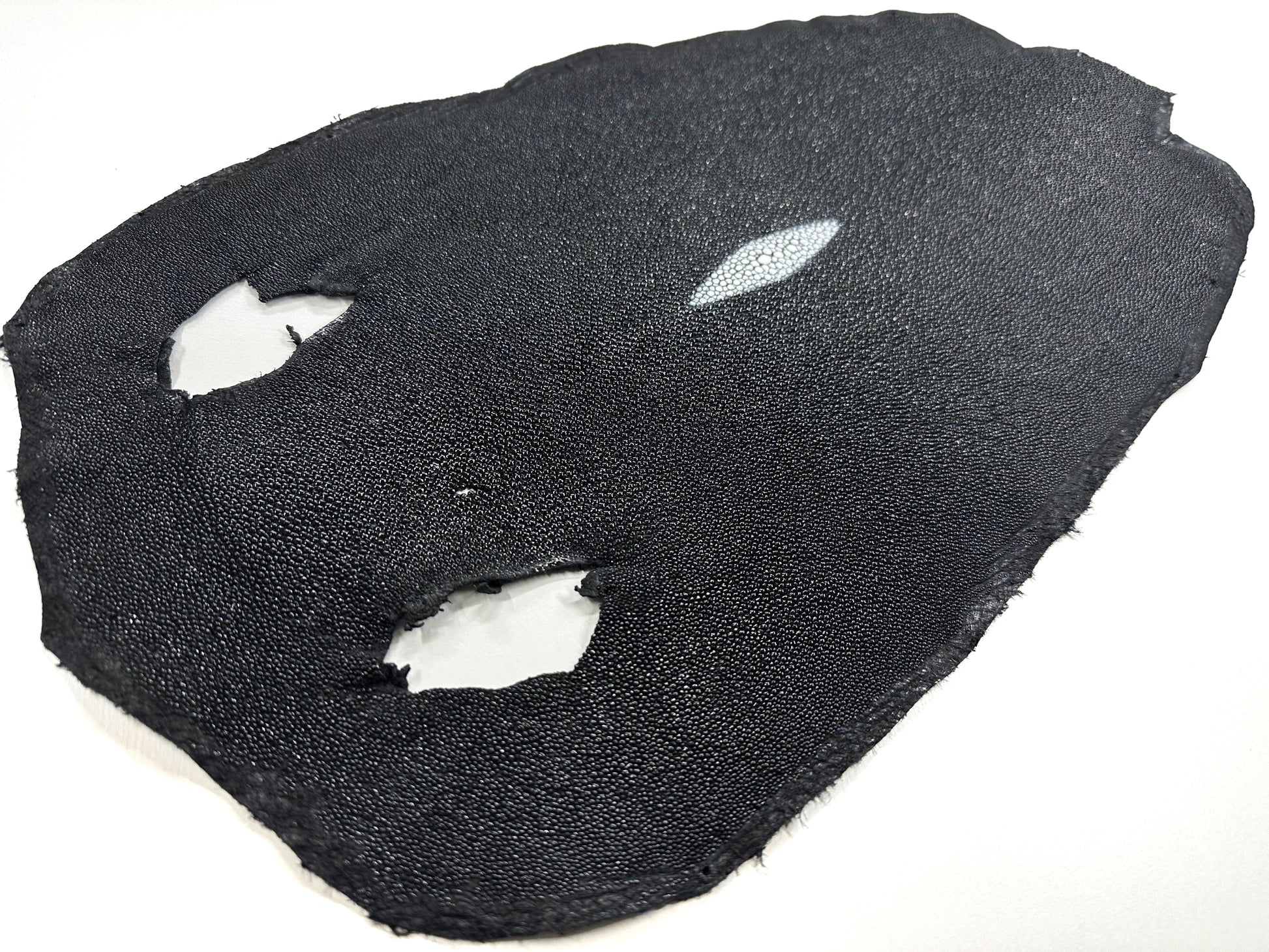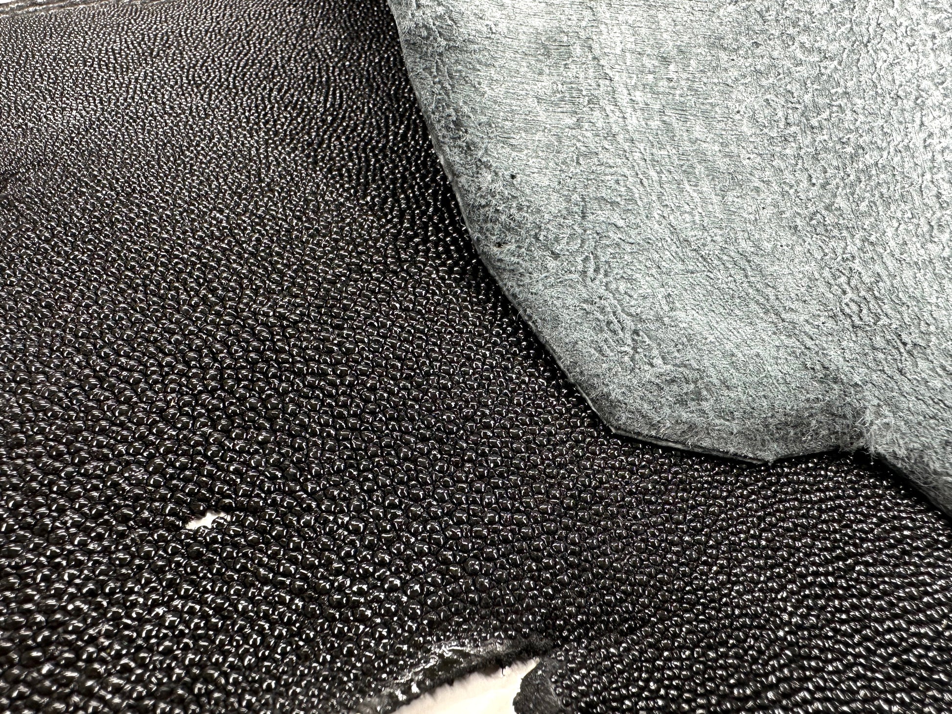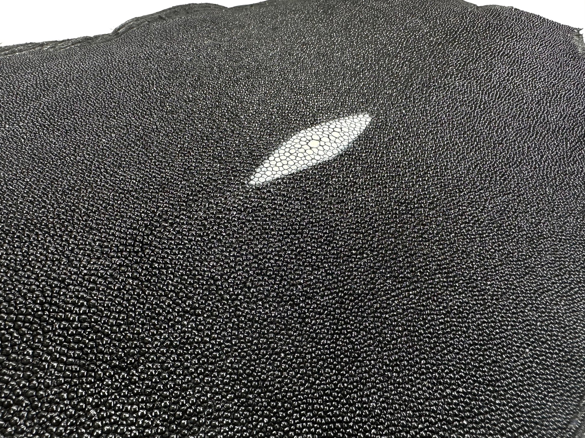 A one-of-a-kind leather with a unique skin that looks like it's covered with beads and a jewel-like shine that emanates from its hard texture.