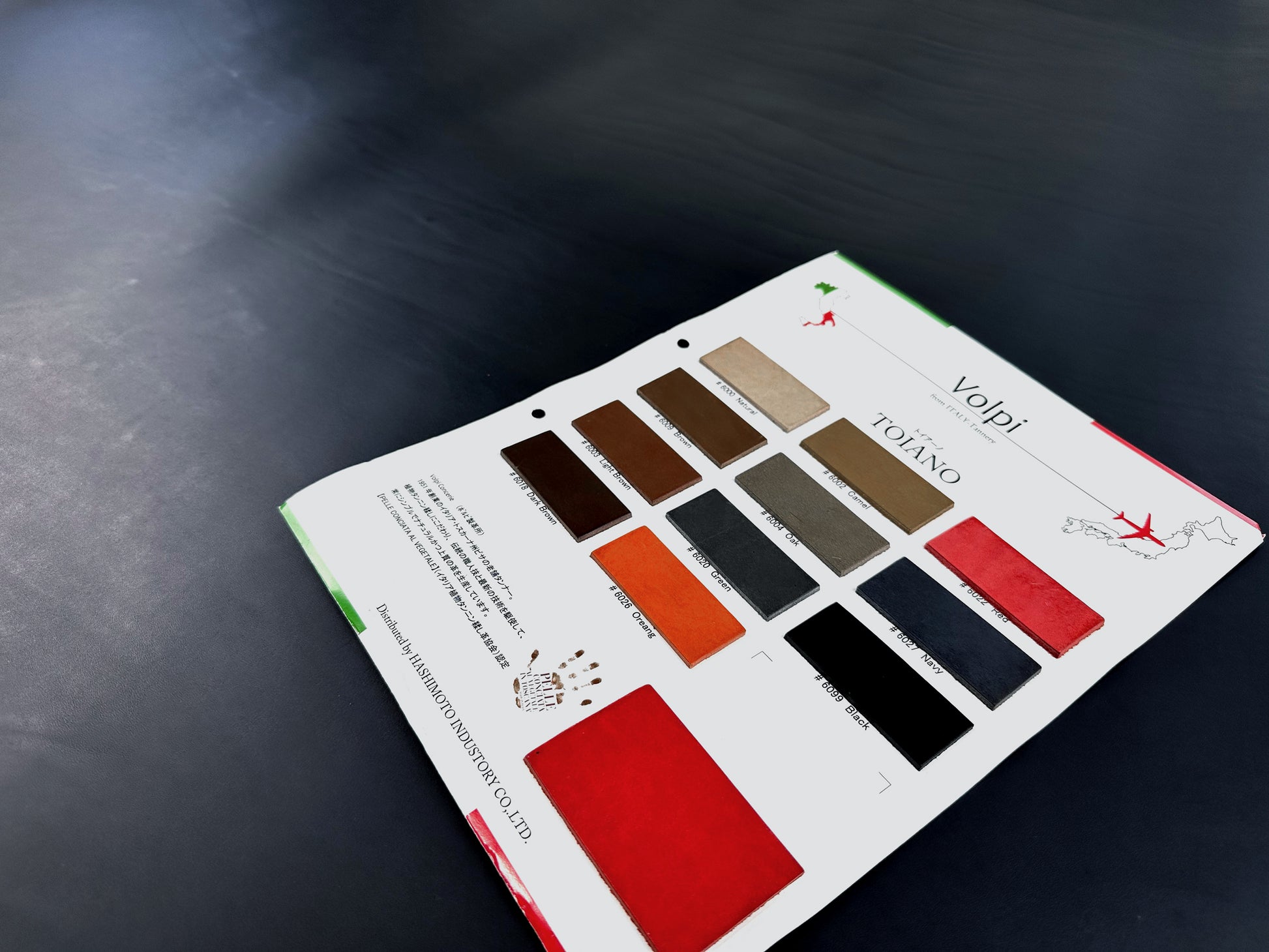 VOLPI社の革は、手形のロゴが特徴的な、トスカーナ地方の「イタリア植物タンニンなめし革協会」(PELLE CONCIATA AL VEGETALE IN TOSCANA)が発行する、品質保証の商標を取得しており、正真正銘のトスカーナ産植物タンニンなめし革であることを保証しています。